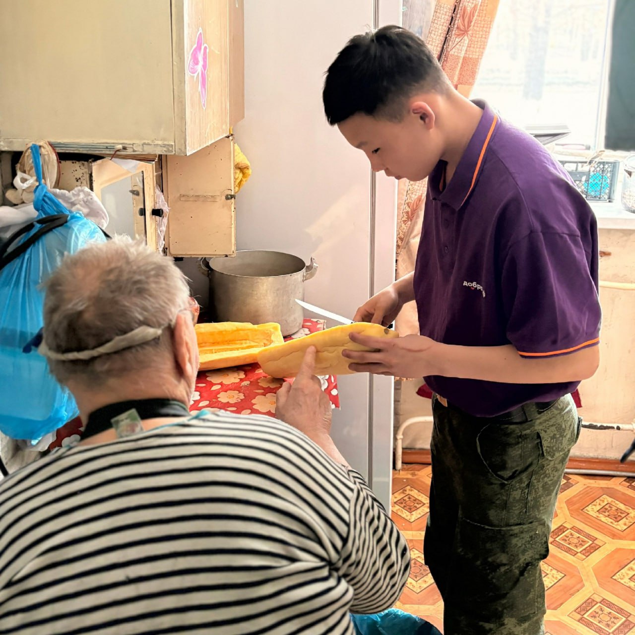 Ребята провели в квартире генеральную уборку и приготовили заготовку из кабачков. Александр был тронут заботой и вниманием, поблагодарил волонтеров и пожелал им здоровья и радости.