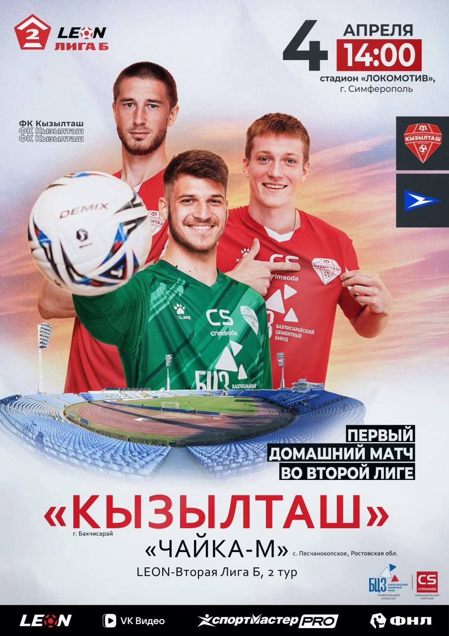 Бахчисарайский «Кызылташ» проведёт первый домашний матч в LEON-Второй лиге Б России. Наша команда встретится с ФК «Чайка-М» из Песчанокопского (Ростовская область).