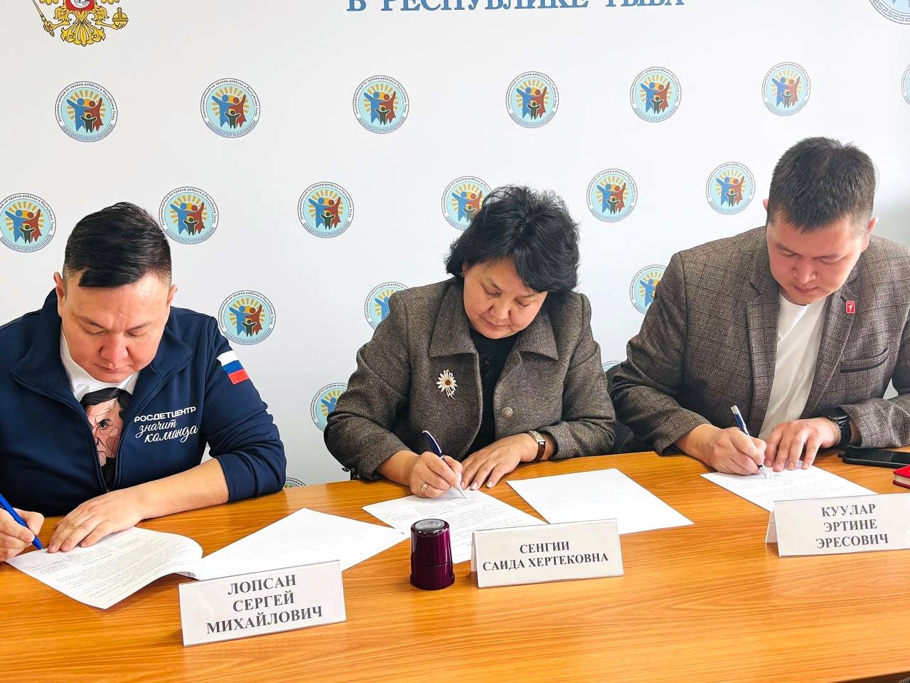 Подписи под документом поставили председатель Совета реготделения «Движения первых» Эртине Куулар, региональный координатор проекта «Навигаторы детства» Сергей Лопсан и Уполномоченный по правам ребенка в Туве Саида Сенгии.