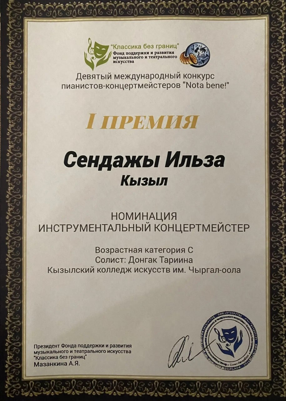 Преподаватель и концертмейстер Кызылского колледжа искусств им. А. Чыргал-оола Ильза Сендажы стала лауреатом I премии в номинации «Инструментальный концертмейстер» IX Международного конкурса пианистов - концертмейстеров «NOTA BENE», проходившего с 10 января по 22 марта 2026 года.
