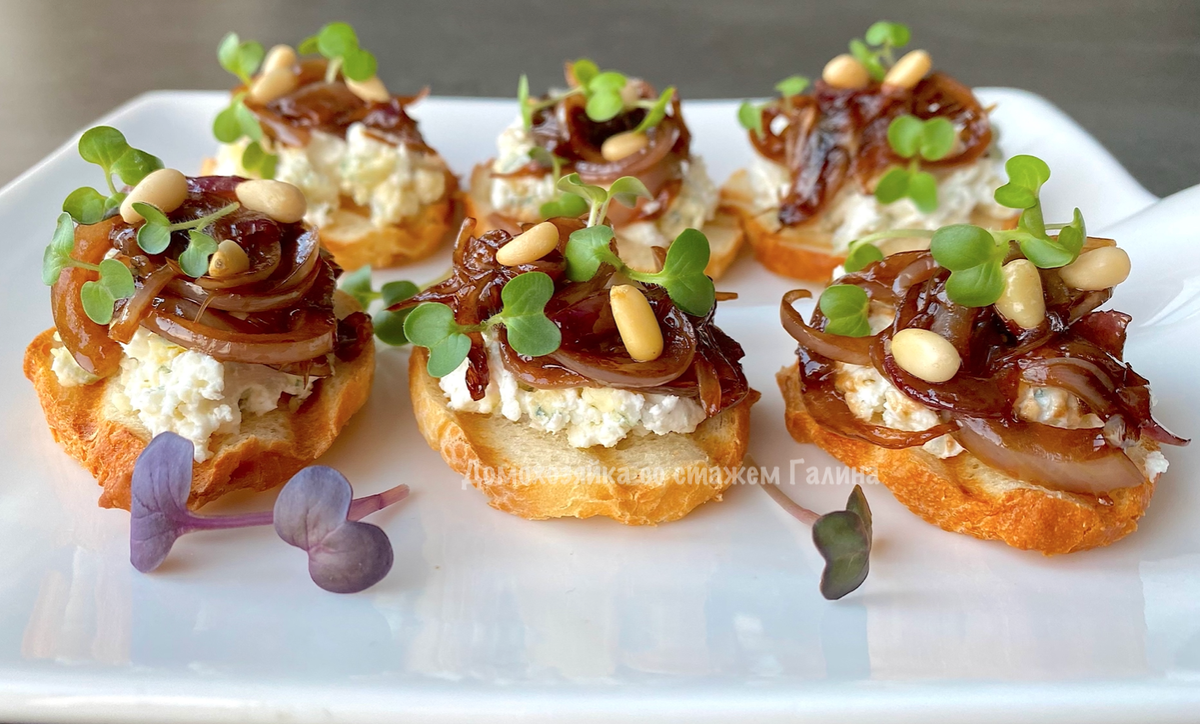 5. Нарежьте багет на тонкие ломтики и слегка поджарьте их на гриле или в тостере. На подсушенные кусочки выложите сырную массу, сверху добавьте остывший луковый чатни.