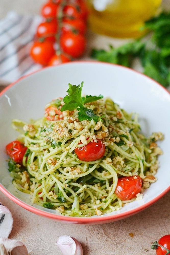 Эта паста — настоящая находка для постной кухни! Она украшена сочным шпинатом и помидорами черри, а вкус грецких орехов добавляет изюминку. Простой и в то же время оригинальный рецепт, который порадует всех!