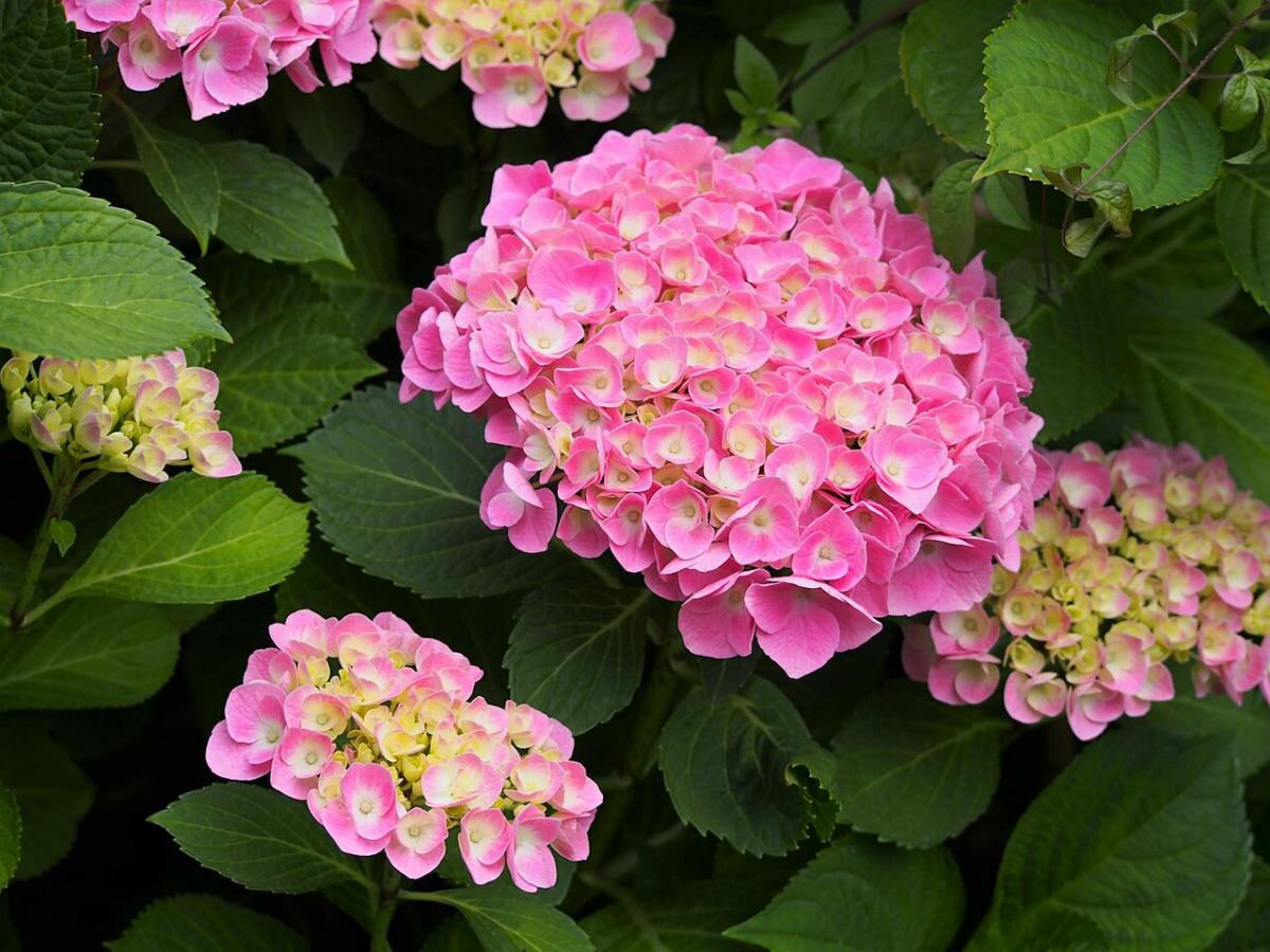 - Гортензия крупнолистная (Hydrangea macrophylla): известна своими огромными цветами и цветет как на старых, так и на молодых побегах.