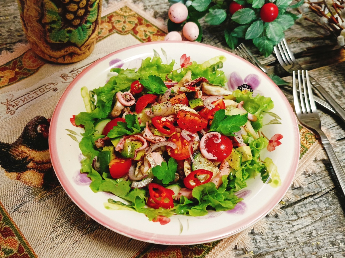 Этот салат — настоящая находка для тех, кто хочет порадовать себя и близких ярким вкусом и свежими ингредиентами. Вдохновленный праздником, этот легкий и аппетитный салат идеально подходит как для праздничного стола, так и для повседневного обеда.