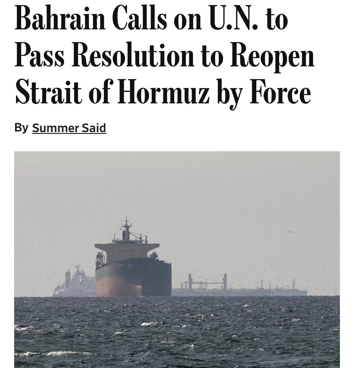 Бахрейн совместно с ОАЭ добивается от Совбеза ООН резолюции, разрешающей применение силы для открытия Ормузского пролива и предотвращения гуманитарного и экономического кризиса, говрится в материале.