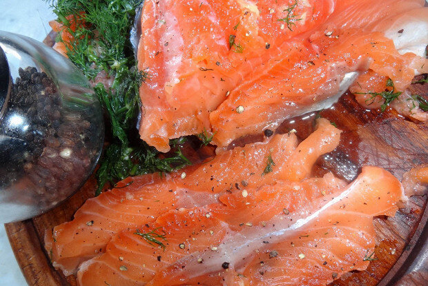 1. Сначала филе свежего лосося с кожей (не мойте!) разместите в подходящей ёмкости для соления, желательно керамическом противне, кожей вниз.