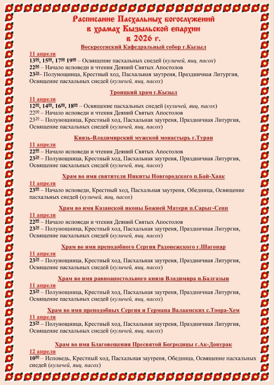РАСПИСАНИЕ ПАСХАЛЬНЫХ БОГОСЛУЖЕНИЙ В ХРАМАХ КЫЗЫЛСКОЙ ЕПАРХИИ 11-12 апреля 2026