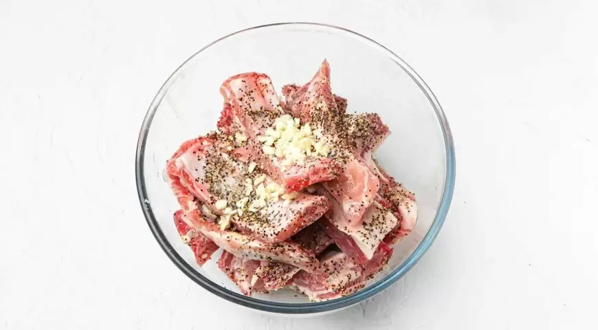 Для начала необходимо подготовить свиные рёбра – их следует аккуратно разделить, разрезая вдоль каждой косточки. Чеснок очищают и измельчают. В глубокой миске тщательно перемешивают ребра с солью, перцем и любимыми специями, добавляют чеснок и слегка сжатый лимонный сок. Все это оставляют на ночь для маринования.