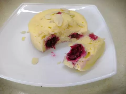 Затем переливайте тесто в форму, диаметром около 10 см. К вашему усмотрению, добавьте вишню или другие ягоды для улучшения вкуса и цвета, это сделает десерт еще более аппетитным.