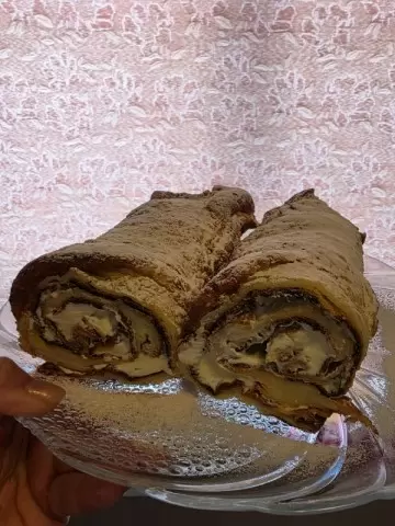 Смешайте все ингредиенты для крема и распределите его по остывшему блинному рулету. По желанию можно посыпать сахарной пудрой, что добавит внешнему виду больше привлекательности.