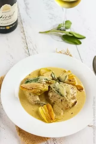 Создавая это блюдо, разработчики его рецептуры учитывали, что каждый компонент играет важную роль. Сочная курица наполняется густым сливочным соусом, который обеспечивает не только великолепный внешний вид, но и поразительное сочетание вкусов. Шалот и чеснок обжариваются до полного размягчения, что придаёт сладость, а свежие веточки шалфея и тимьяна добавляют аромата и создают совершенную гармонию.