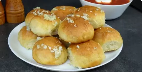Разогреть духовку до 180°C и выпекать пампушки в течение 15 минут. Пока они готовятся, следует приготовить заливку: смешать 50 мл воды, 3 ст. ложки масла и пропущенный через пресс чеснок. Полить пампушки заливкой и вернуть в духовку еще на 2–3 минуты.
