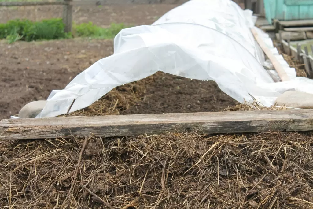Навоз следует смешивать с опилками или соломой, чтобы предотвратить его слеживание и обеспечить кислород для микроорганизмов. Рекомендуемая пропорция — 1:1. Работы по устройству грядок начинают сразу после таяния снега и оттаивания земли.