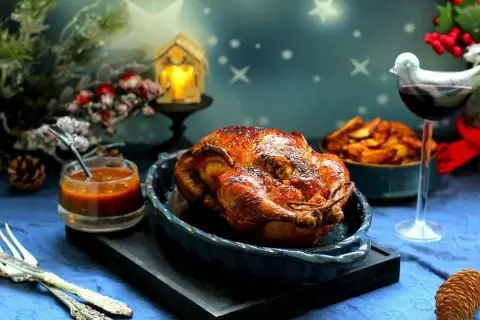 Готовую утку подают с запеченным картофелем и обильно поливают соусом, добавляя клюкву для контраста. Это блюдо не просто насыщено вкусом — оно стало настоящим праздником на вашем столе!