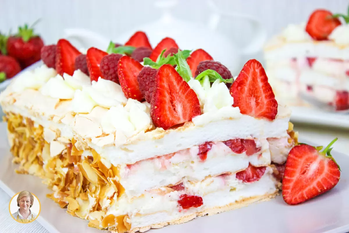 Пока меренга остывает, следует подготовить крем: для этого маскарпоне взбивается с жирными сливками и сахаром до получения однородной массы. На первый корж меренги аккуратно наносят часть крема, сверху выкладываются кусочки свежей клубники. Укладывают второй корж, повторяя процесс. Последний корж смазывают оставшимся кремом и обсыпают обжаренными миндальными лепестками. Торт помещают в холодильник на 1-2 часа для стабилизации крема перед подачей.