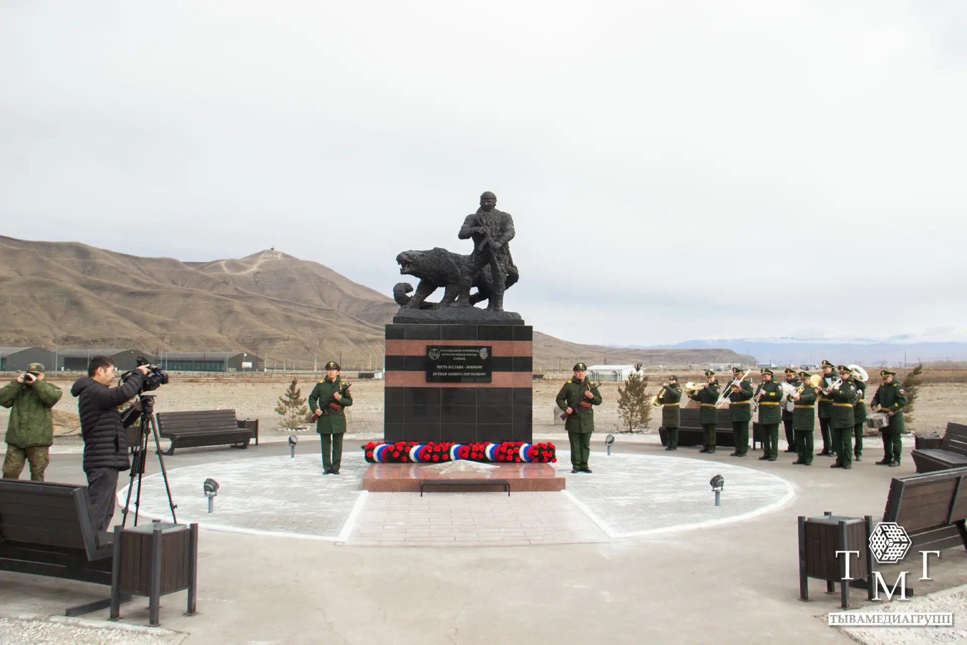 Осмотрев учебные комнаты и музей, Владислав Ховалыг продолжил осмотр территории части. Следующим пунктом стал памятник военнослужащим, открытый к десятилетию 55-й бригады. Глава республики возложил к нему цветы в знак памяти.