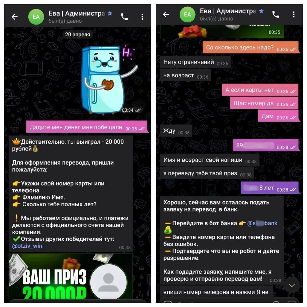 Схема началась с "выигрыша" 20 тыс. рублей в мессенджере. Под предлогом получения приза аферисты втянули ребенка в переписку, узнали его имя, возраст, телефон, с кем он живет и где. Школьник рассказал злоумышленникам все!